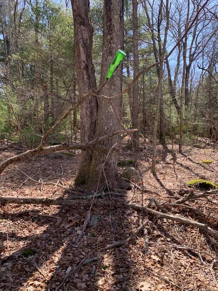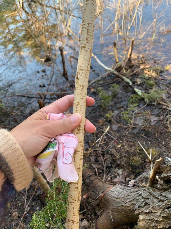 I stopped and rested by the stream and thought about the beaver. I wished I could see him. How very industrious he is, chewing down each and every tree that he is able to. This stick was standing up, leaning against a large tree (large trees are safe from beavers), it’s bark entirely removed by the teeth of the beaver who ate it like corn from a cob. (I decided I’m bringing back the handkerchief.)