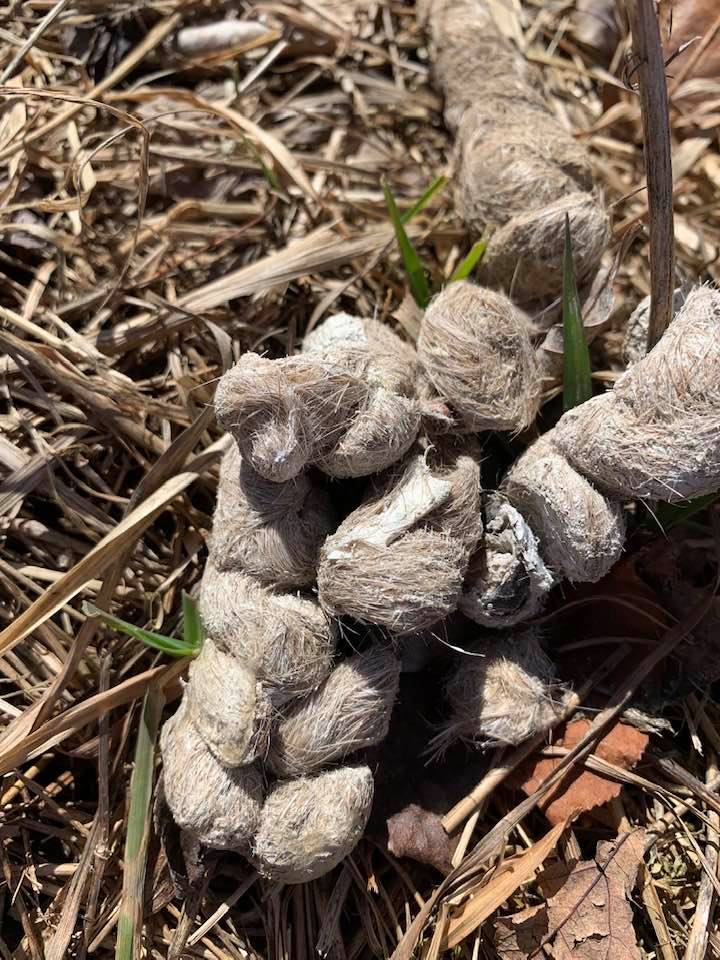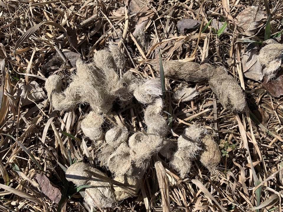 Then, my feet led me to a spot in the field where some scat lay. I noticed that it appeared to be entirely fur. As I stood there looking down at it, I saw something within the fur that looked otherwise. So I took a stick, knelt down, and started poking around.