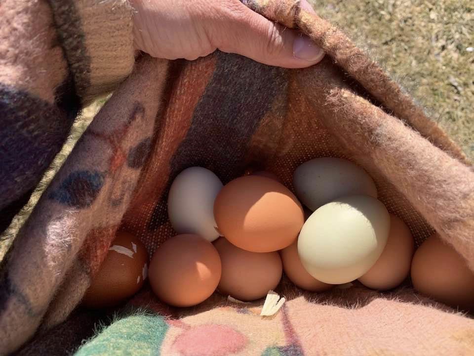 I gathered eggs for the cake; produced for us daily by a flock of feathered hen-friends. I gave one to the dog (who knows that he has to drop it, not on the soft lawn, but on the driveway, so it will crack open and he can eat it) and then put the rest in the house before going for a walk.