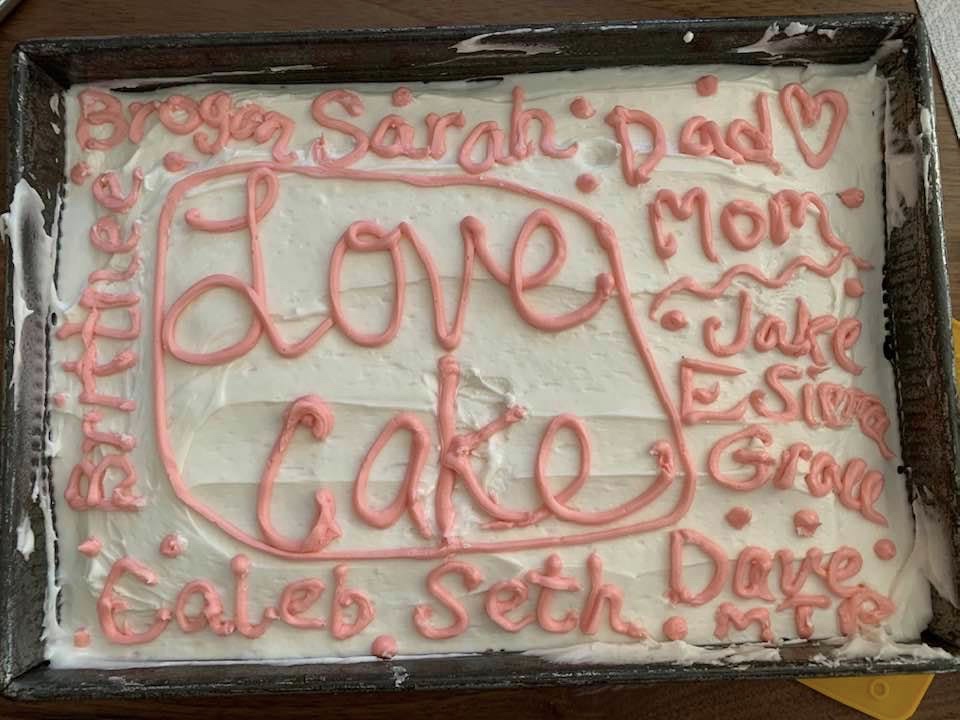 From that to baking. I was able to use up six eggs on my cake. By the time it had cooled Rich was in the house, the boys were home from school, and Sarah and Brittnee were home from the apartment (where they hung out today, to wait for a couch to be delivered). Therefore, I had an audience watching me frost the cake. “What are you going to write on it, Mom?” they cried.