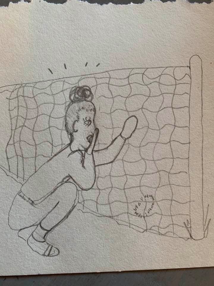 I left the house with a piece of quiche in my hand (yum) and went on a walk. It was cool outside so I wore jeans and a sweatshirt and off I went, listening to a podcast. I saw nothing of note until I turned around and came home. Then, next to the neighbor’s chainlink fence on the ground something caught my eye. I didn’t have anyone with me so I had to come home and draw a picture of myself in this moment of discovery: