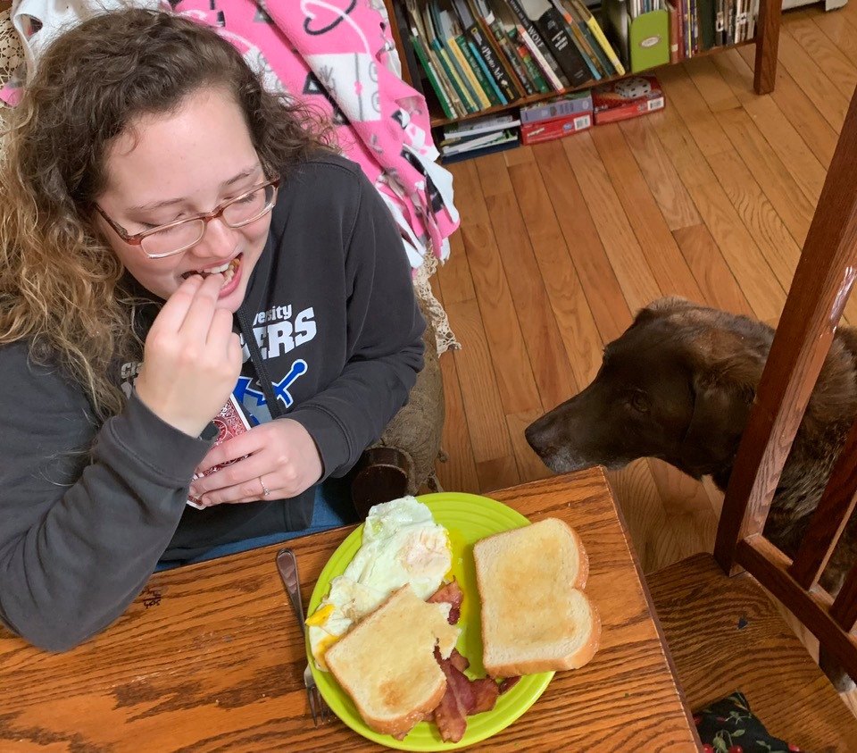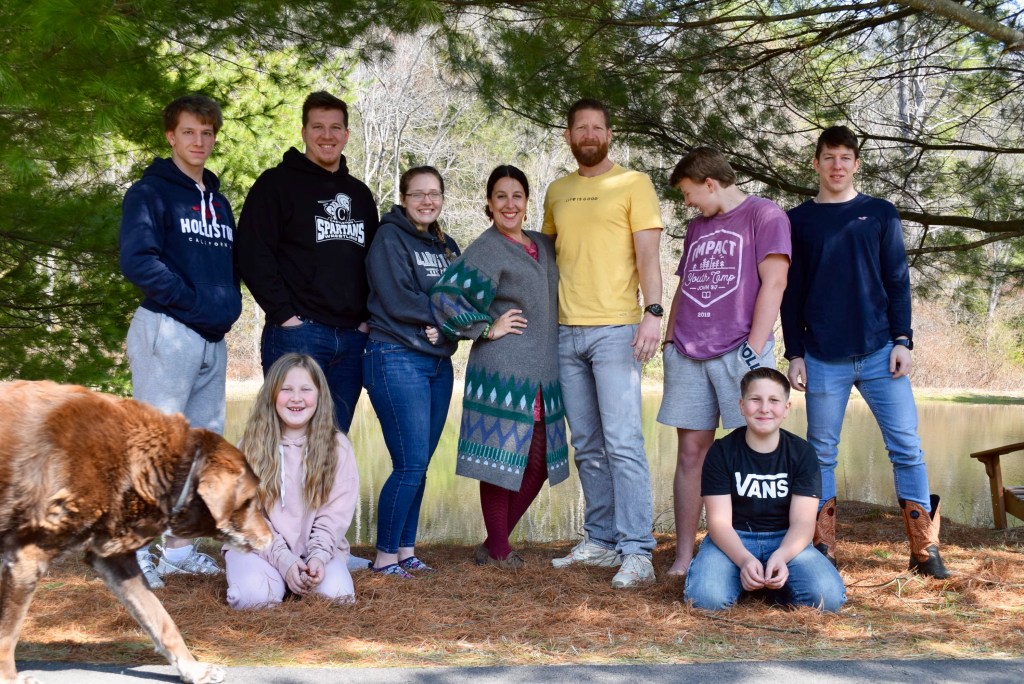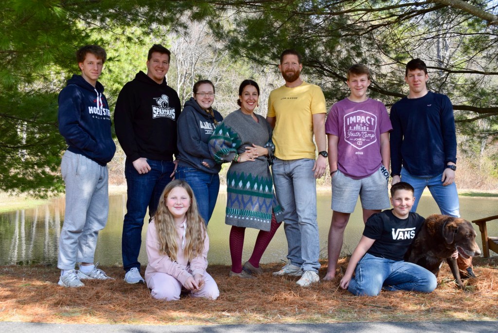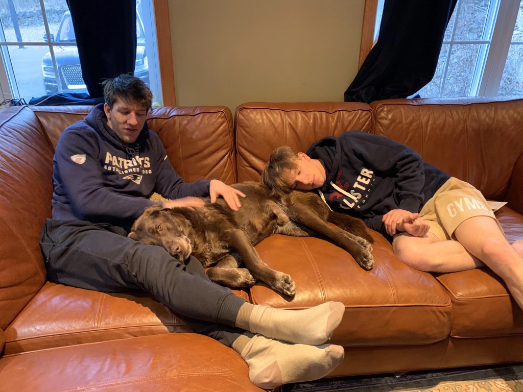 On Easter Sunday! We were all together, all but Grace, and we had a rich and full day of family togetherness. After our ham dinner, I went for a walk and when I came back, Rich was leaving the driveway with three boys and Jacob was right behind him in his car with Brittnee, too. Rich rolled down his window to tell me that something was wrong with Parker and they were taking him to the vet. Seth was crying upstairs in his room and Sarah was distraught in the living room. I needed to stay behind with them. A little while later he called us and said that Parker’s heart was failing and there was nothing that could be done……I had a feeling of “fight or flight” panic as I all of a sudden wanted to be there for this faithful dog who had spent so many years with us, but in the end I comforted myself with the thought that he had his boys with him. We adopted him as a puppy and we were the only family he ever had…..for fourteen of the busiest and craziest years of our parenting lives. Caleb was 2 when we got him, Seth and Sarah have never known life without him……the older kids grew up with him…..we have so many memories of every kind…..because our dog (like all loved dogs) was everything to us and our seven children; fun, playful, mischievous, a run-away, pizza lover, sleep mate, explorer, friend, thief, comfort, listening ear, patient, pain-in-the-butt, faithful, naughty, and kind. He inspired songs, dances, stories, and inventions. He was given a house, food, warmth, and love, and he gave it all in return, plus more.