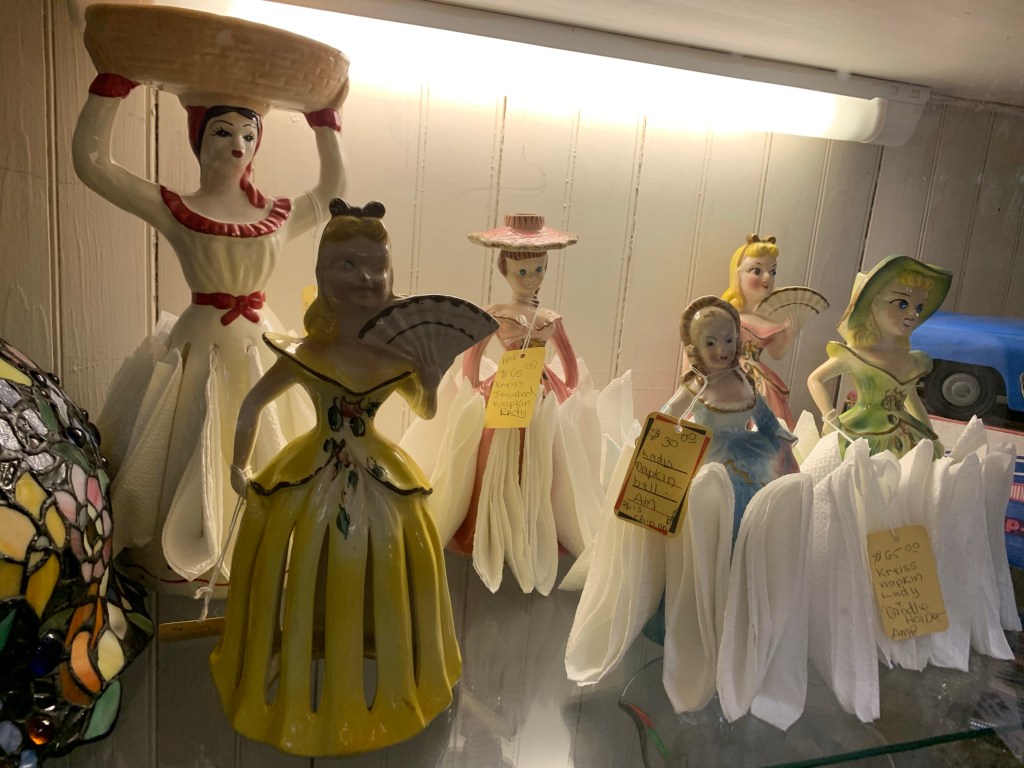 My lady is a napkin holder!! The openings in her bell-skirt are for folded napkins! I saw six more today. Yesterday I saw one and today I saw six. (I did not purchase any today).