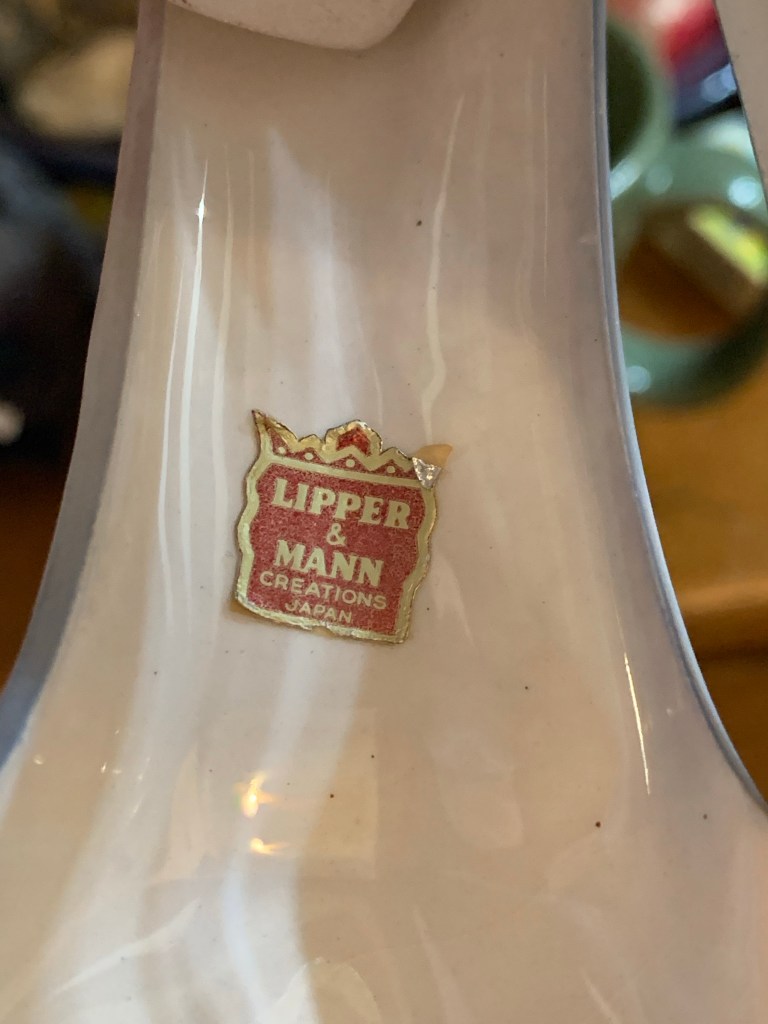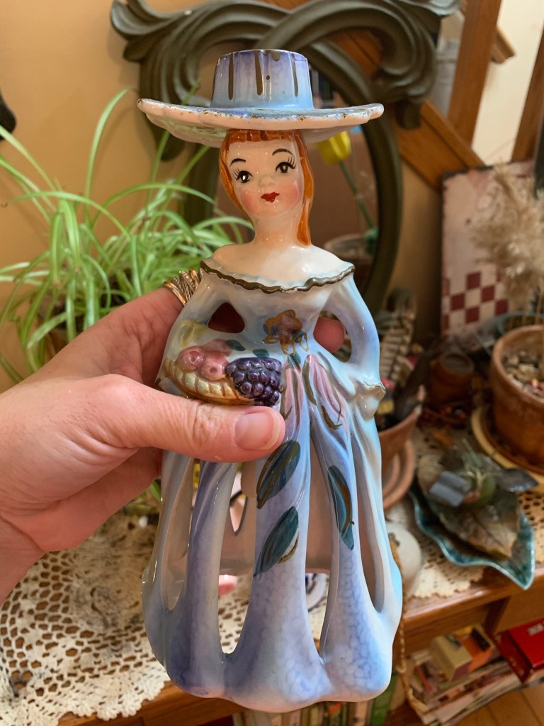 I didn’t know what she was and I hadn’t noticed anything like her before in all my adventures. She was 50 cents. Her hat had a mended brim, which I didn’t mind. Her skirt was a bell! Her head was a candle stick holder! She was so pretty! I had to bring her home.