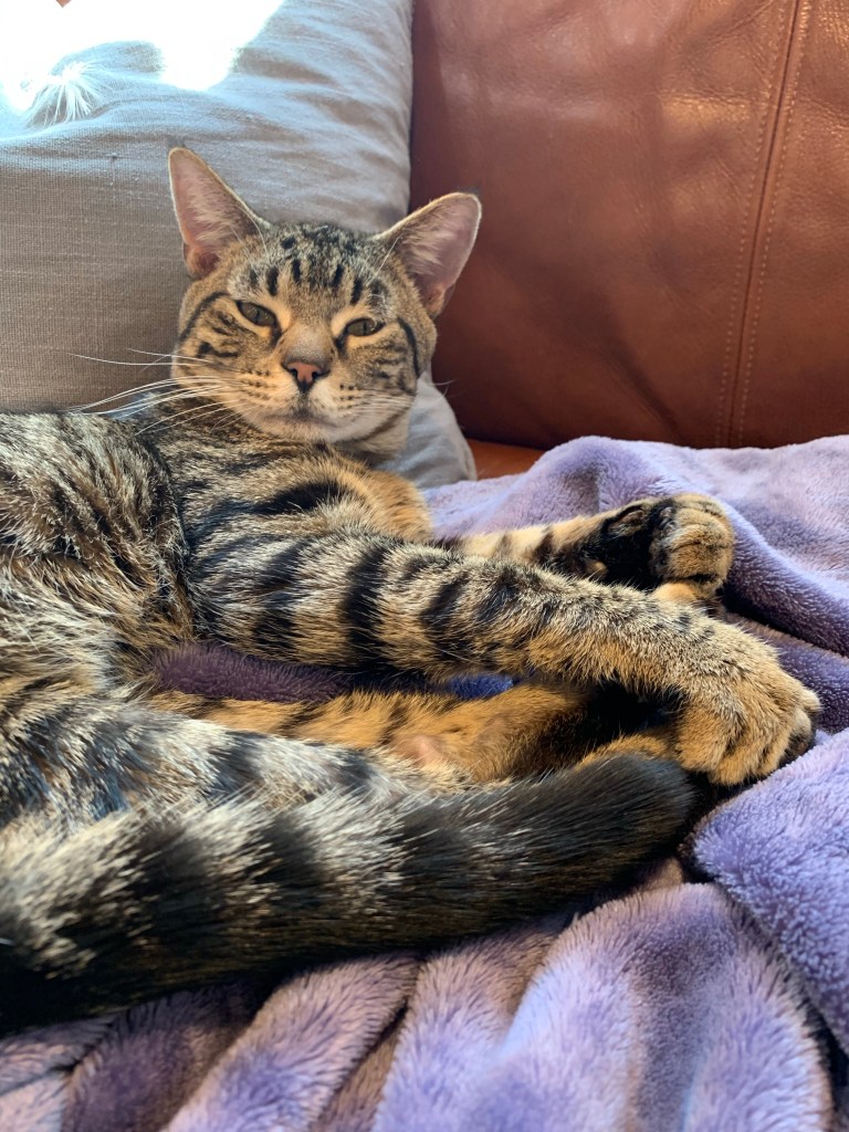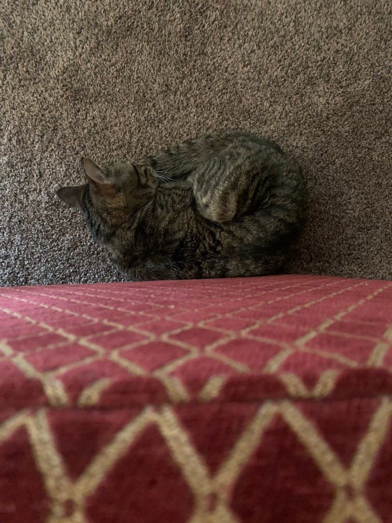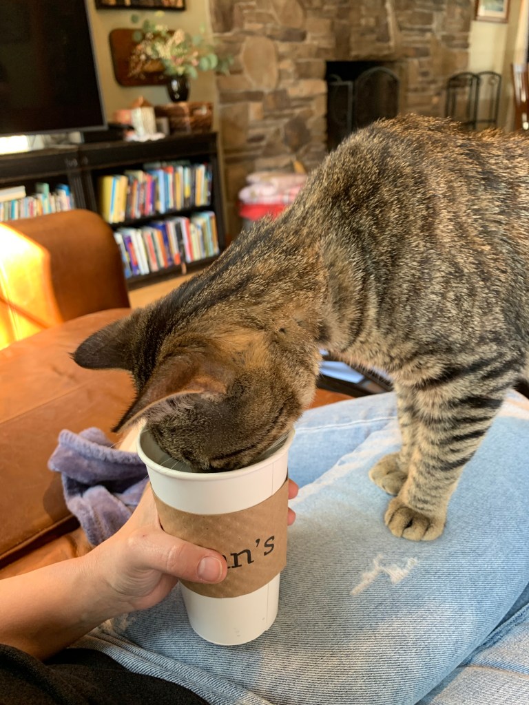 He drinks from the toilet and eats from the kitchen sink and I wonder if his previous owner ever gave him a proper meal for cats, you know like actual cat food in a dish?. He’s obviously not partial to bowls and saucers. He only weighs seven pounds. He’s had butter, a leftover sausage, part of Davids egg sandwich including the bread, and some of my matcha latte. Who knows how long he was outside starving in the cold winter.