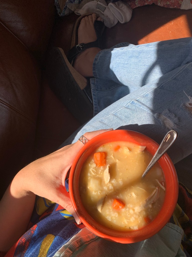 I was dancing around the house coughing with a box of tissues for alas I was sick with a mild cold that had kept me up half that night. I sent a note (rolled up and tied it to a dove) to my friend Kati, who has amazing hair and also two baby boys. And what I wrote to her in the note said, “Dearest Kati, I will miss you for I cannot travel to the donut shop as I have a terrible cold.” Soon, the dove returned saying “I will arrive later with soup for you.” I knew what she meant, because she’s given it to me before; a Very Healing Chicken Soup. I ate it and didn’t get sick again for many many years. In a way I was thankful to once again have a cold just so that I could rejuvenate myself with her delicious soup. At the end of the afternoon, I heard the sound of footprints and there she was, coming to the door with a steaming pot, a smile, and a prayer. Since that moment (midweek) I have had nothing but soup, morning noon and night. It’s rich golden flavor is healing me of all my ails; cup after cup of buttery chicken soup with carrots of brightest color and taste, no celery (cooked celery has the opposite effect on my well being) small chunks of soft potato, and bites of tender chicken. After that first meal of soup, I poured the leftovers into glass quart sized mason jars and found out that even after eating my full I had more soup than she had originally gave to me. I put it away carefully and then slept for a day and a night. This was healing and generous magic indeed.