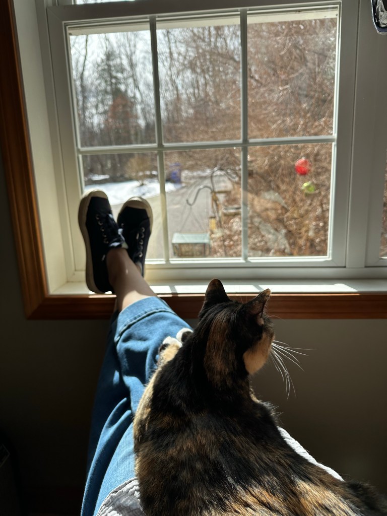 I went grocery shopping, and then ate lunch at home while watching the bird feeders outside the window. I have a rocking chair near enough to put my feet up in the windowsill. The afternoon sun shines in and usually a cat or two comes to watch the birds with me.