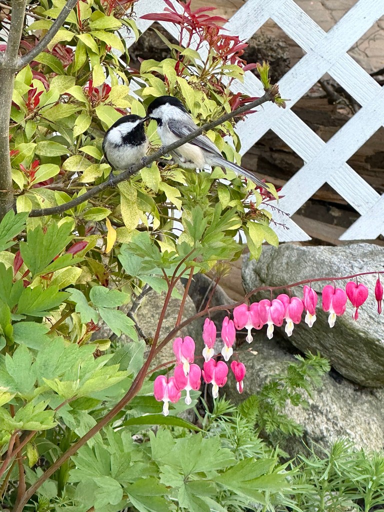 Quite by happenstance, I was on the phone with my dear daughter, child of my heart, who was visiting with a groundhog while we talked of many things and I also had a visitor, a little friendly chickadee. I put dear daughter on speaker so I could still listen as I used my phone to take a photo of the Friendly Bird and just as I took it……along came one more.