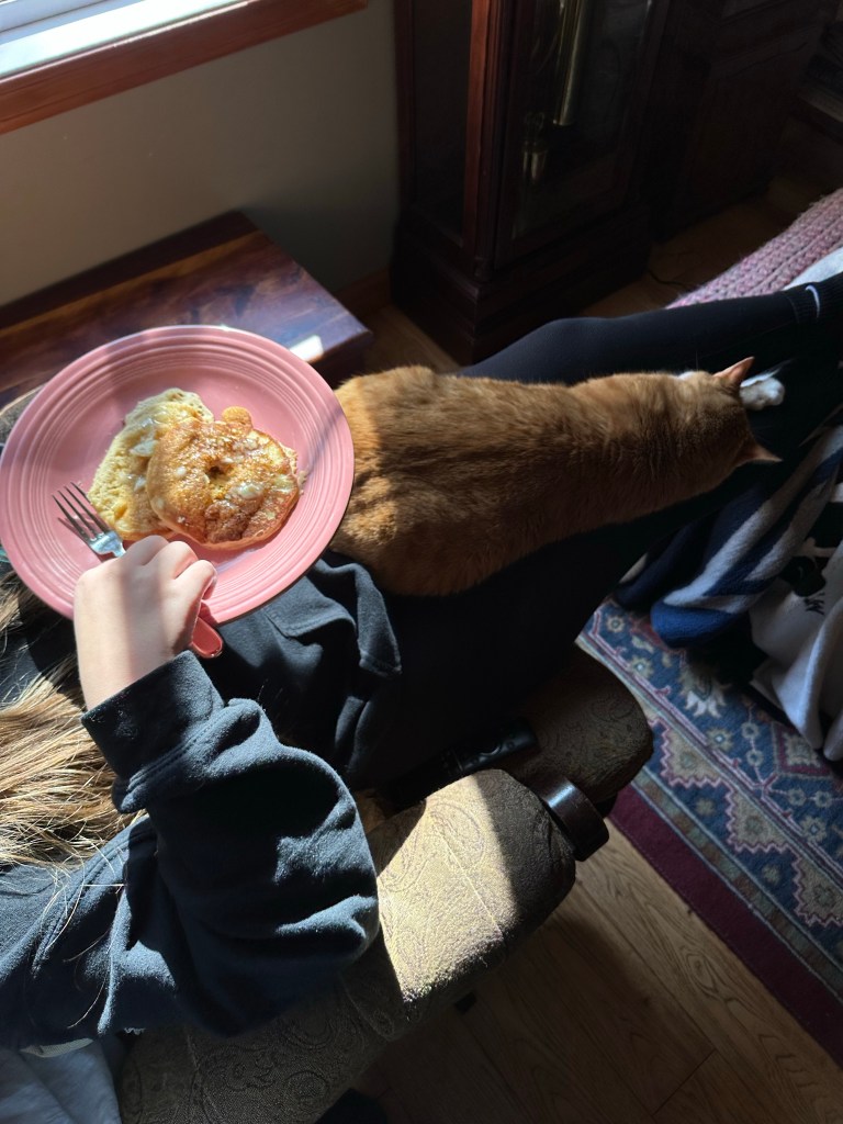 I got up off the couch and set to work. No milk? Thank goodness there was a can of evaporated milk in the pantry. Soon I was flipping golden circles and serving them with plenty of butter to a happy daughter sitting in a sunbeam. It was fun!