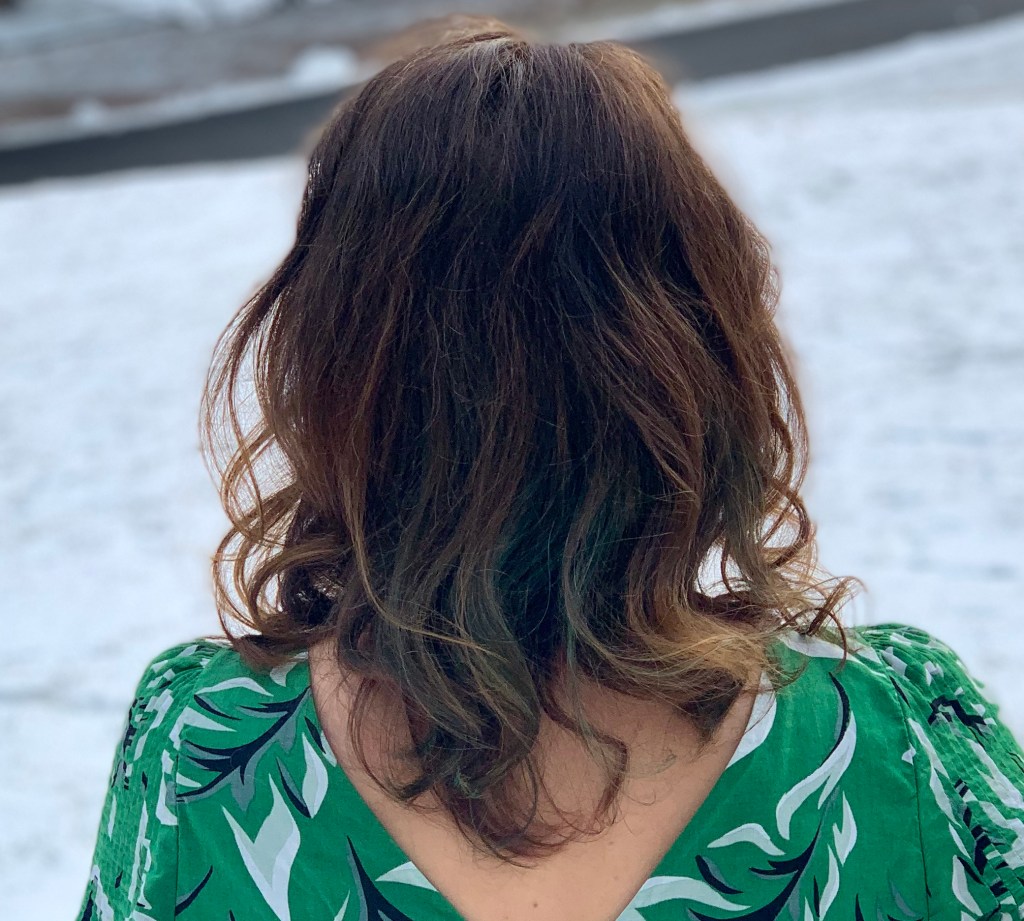 But today, this morning, Sarah took these photos for me, wasn’t that nice of her? And the last one of the back of my hair, I had a “peekaboo” blue dye put in on Friday. I love it. It’s very subtle and almost unnoticable but it’s enough for me!
