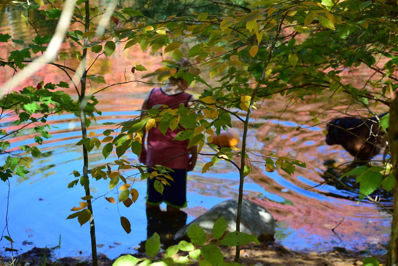 This morning I was cleaning the kitchen and there was a pot of burnt peas in the sink. They were burnt because Sarah and I were sewing pants for her doll and forgot about the peas. (True story) So I left them in the sink until this morning, and then I walked them to the chicken coop. Chickens are partial to burnt peas. Then I continued on my way, looking at how the ponds were filled up nicely after two days of rain. When I got to the stream I could hear the beaver again. Oh joy! It was about 8 am in the morning. I rushed to the house to get my camera, a towel to sit upon, a breakfast in a sandwich bag consisting of cheese, raw mushrooms, and trail mix, and I also put on a pair of jeans because I was still in my pajamas. Then I went down and sat. Very soon I heard a loud splash and then another one. Dang, I thought. There are at least two and they know I’m here. I sat and sat. Then, finally my dreams (beaver dreams) came true. I saw the first one. I saw the second one. And then, one more.