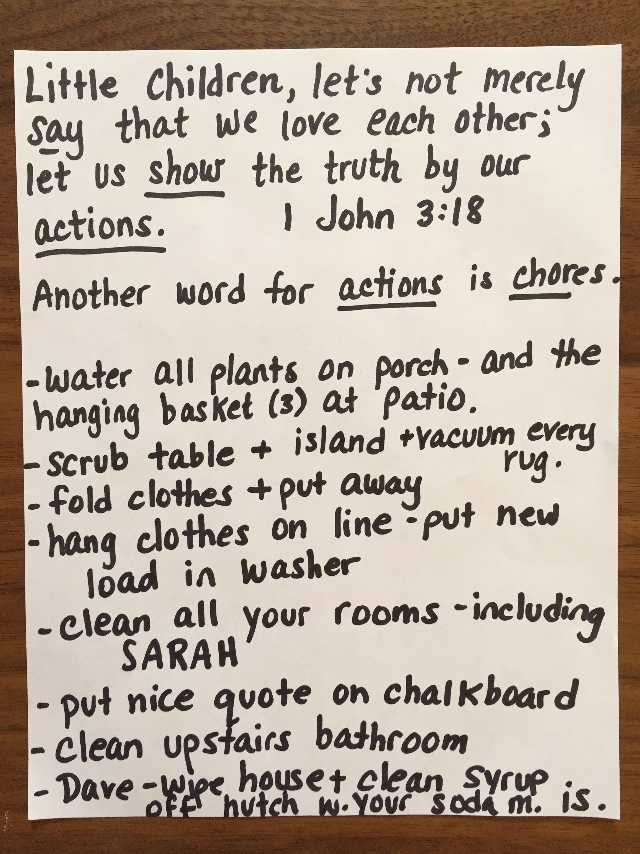 The list I left for the kids on Saturday morning when Rich and I left to get stuff for the wrestling party.