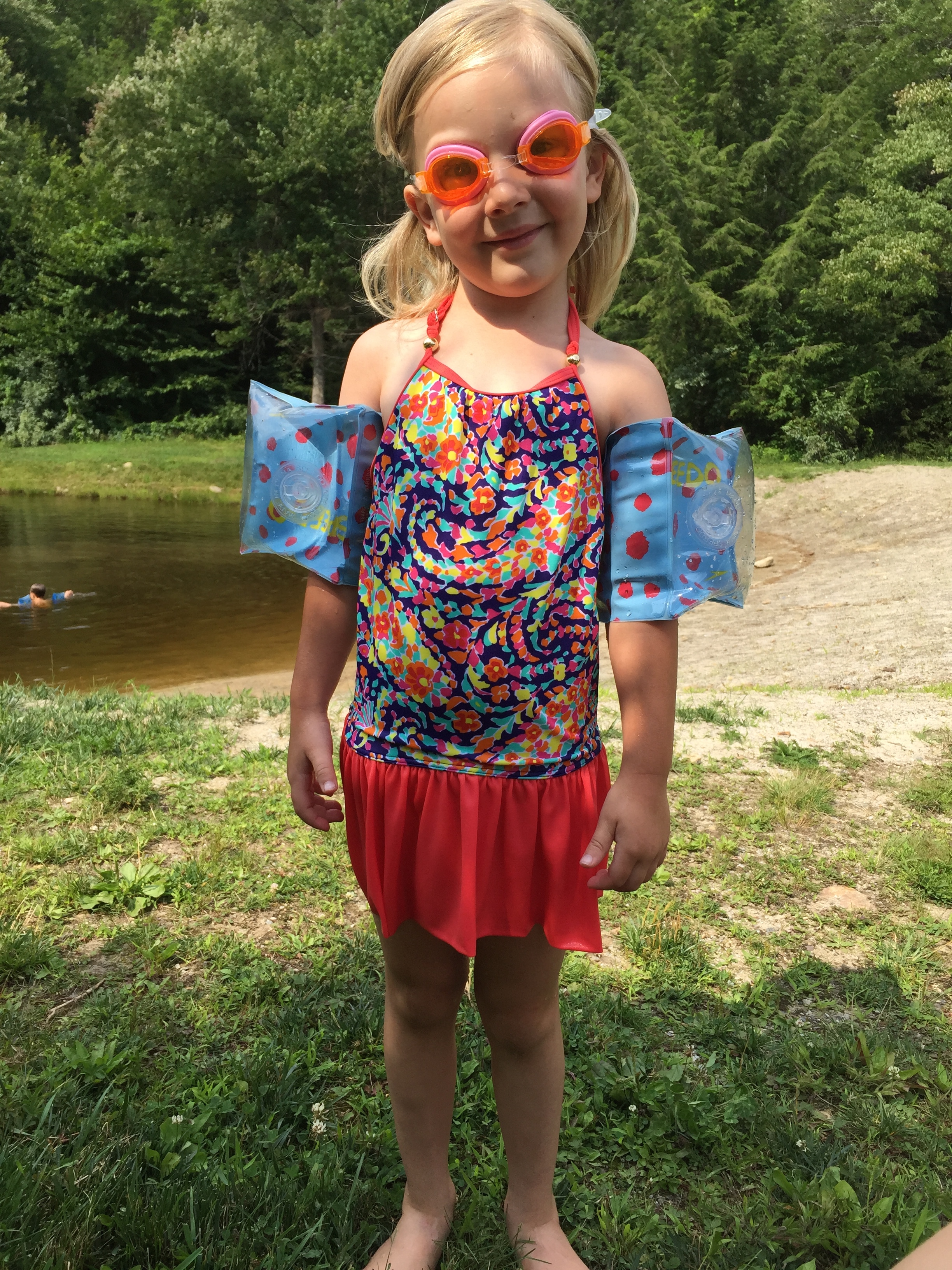 Sarah swimming. Now is the time to get those Land’s End suits on sale for next year! This one is size 6, a little big on her…but so so cute.