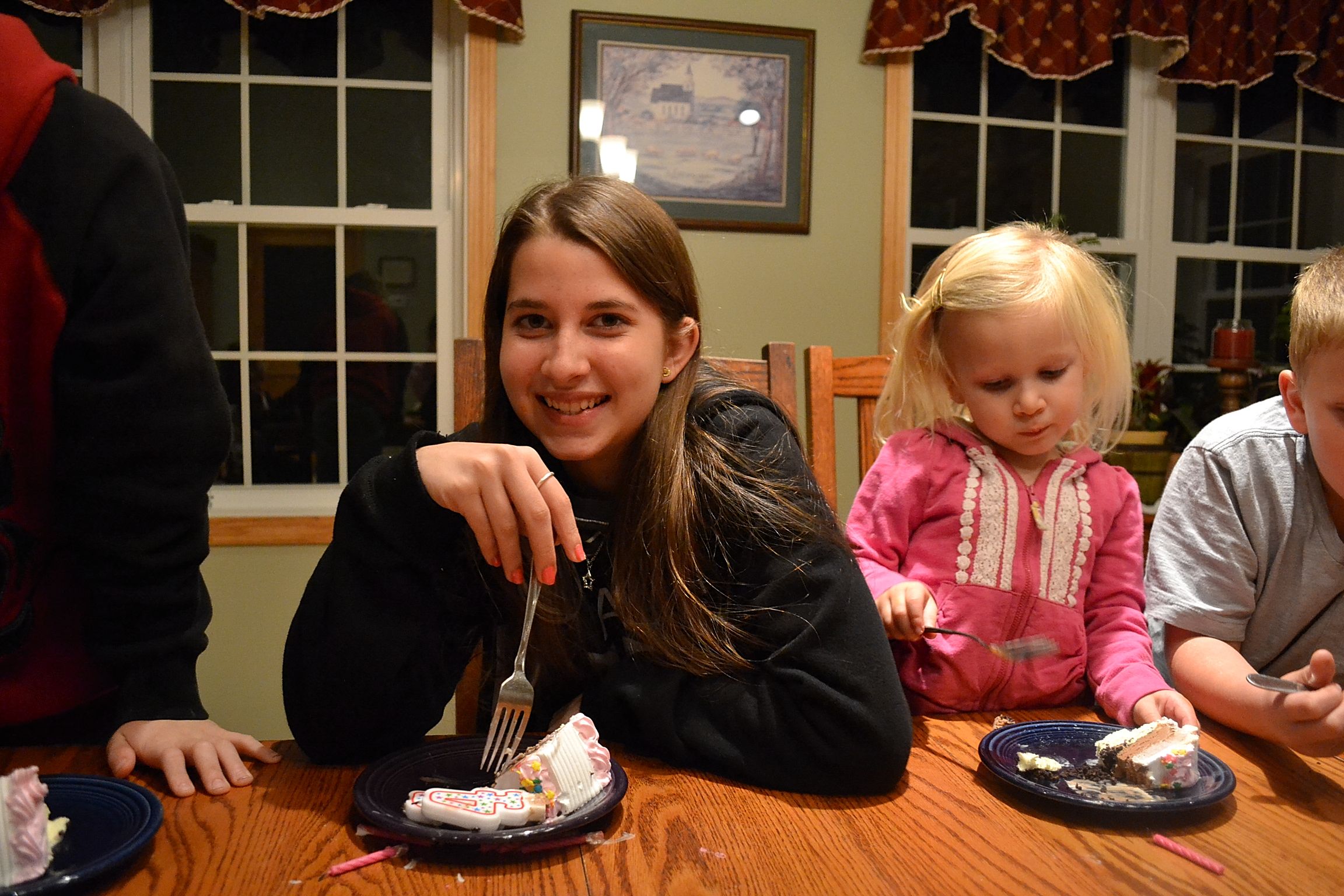 We were served baked chicken, french fries, and corn on the cob. Rich and I took Jacob with us, who ate far more than anyone else at table (he had come from football practice). At one point, he accidently threw his plastic fork. I’ve come to realize that kids of all ages do strange things, you can’t trust any of them in public. LOL (Rich would say the same about their mother)…….