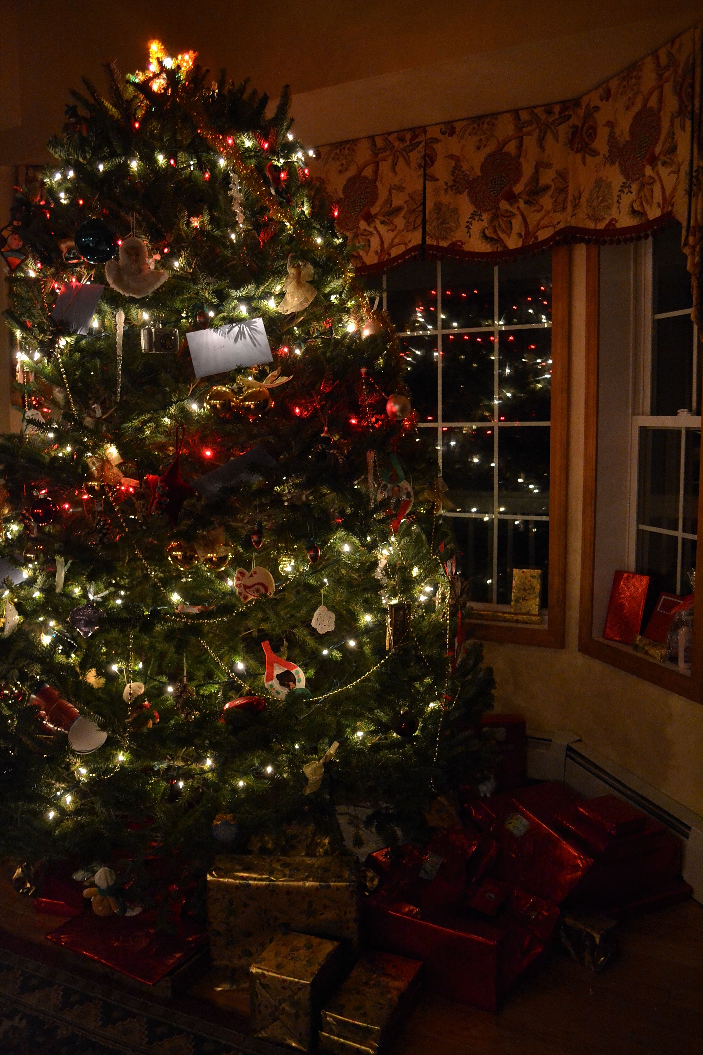 Christmas was nice. Certainly it is more work than magic for the parents, but it is a rewarding work. All the shopping, lists, and making sure everything gets done by December 24 can be rather tiresome. (At least there is a deadline.) I love the photo of the stockings; starting with Rich’s, then the children from oldest to youngest, with mine at the end. The tree lights reflecting in the stove look like there is a fire is going. A sweet friend who owns a greenhouse gave us the gorgeous poinsettias, which I keep faithfully watering. Seth made the red handprint green construction paper wreath and the paper chain.