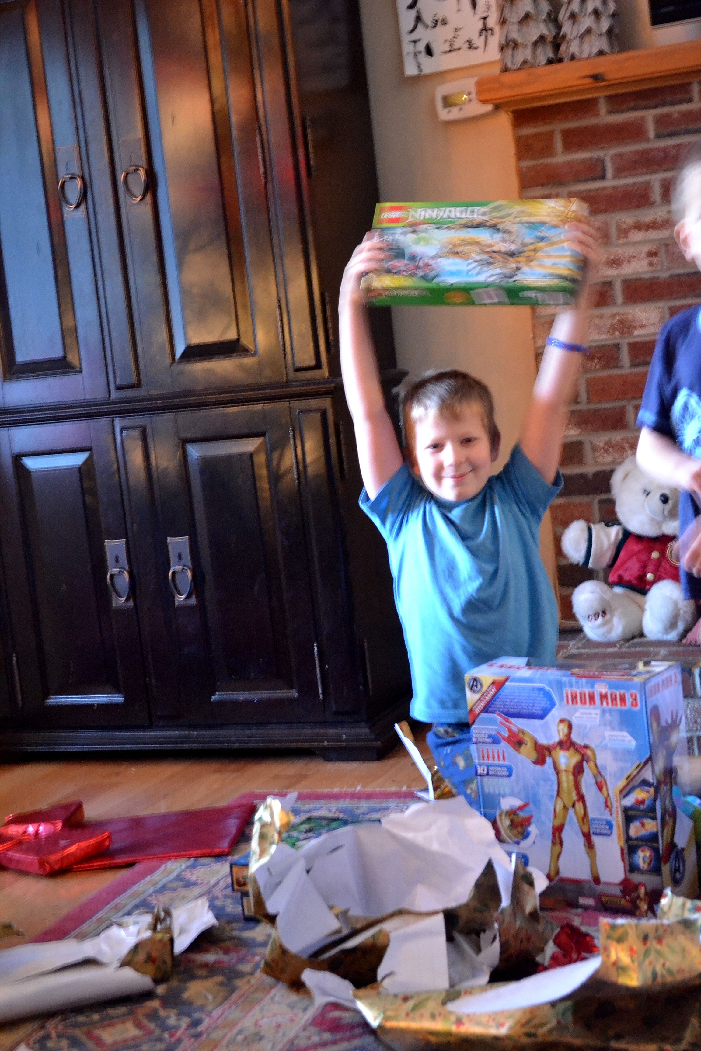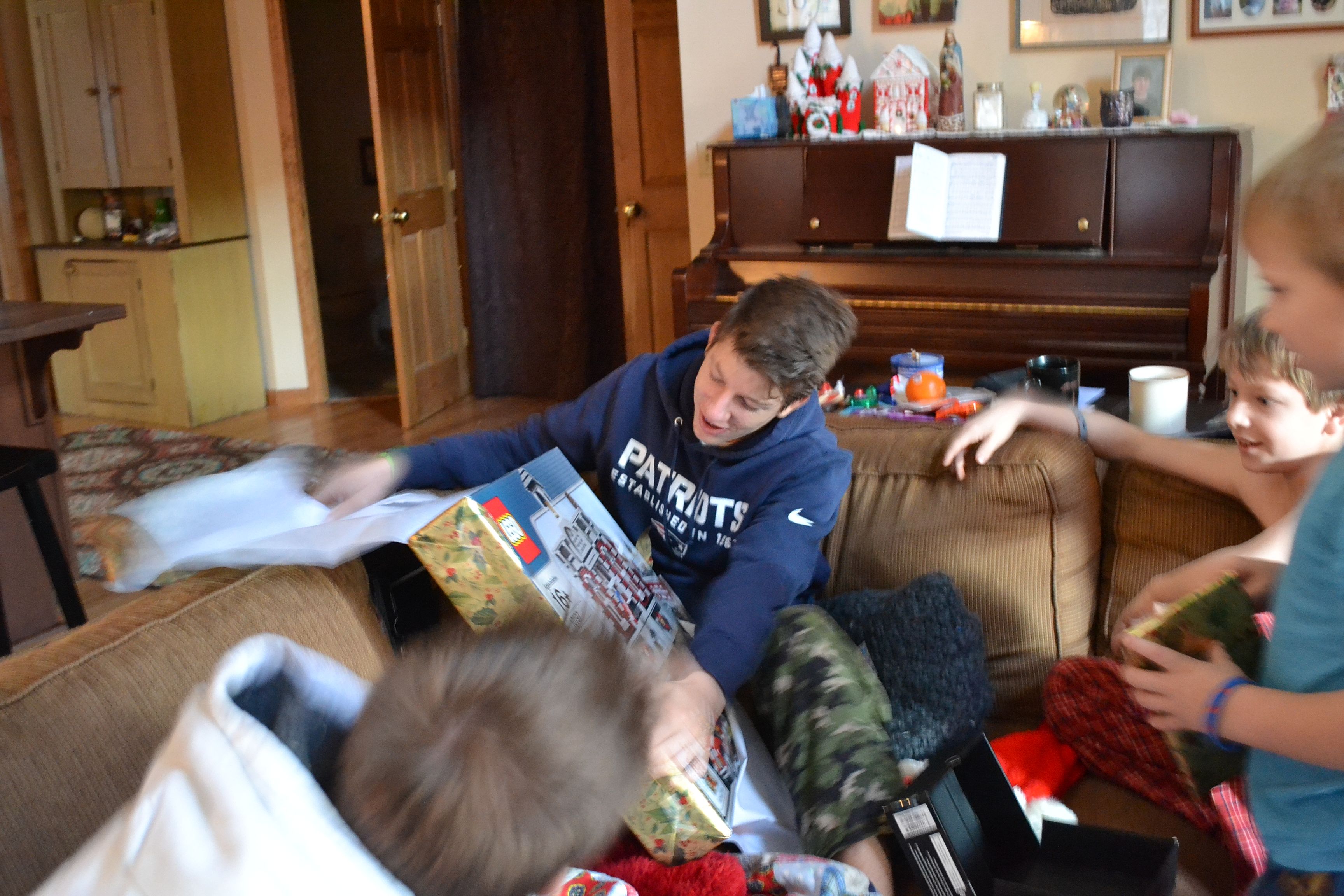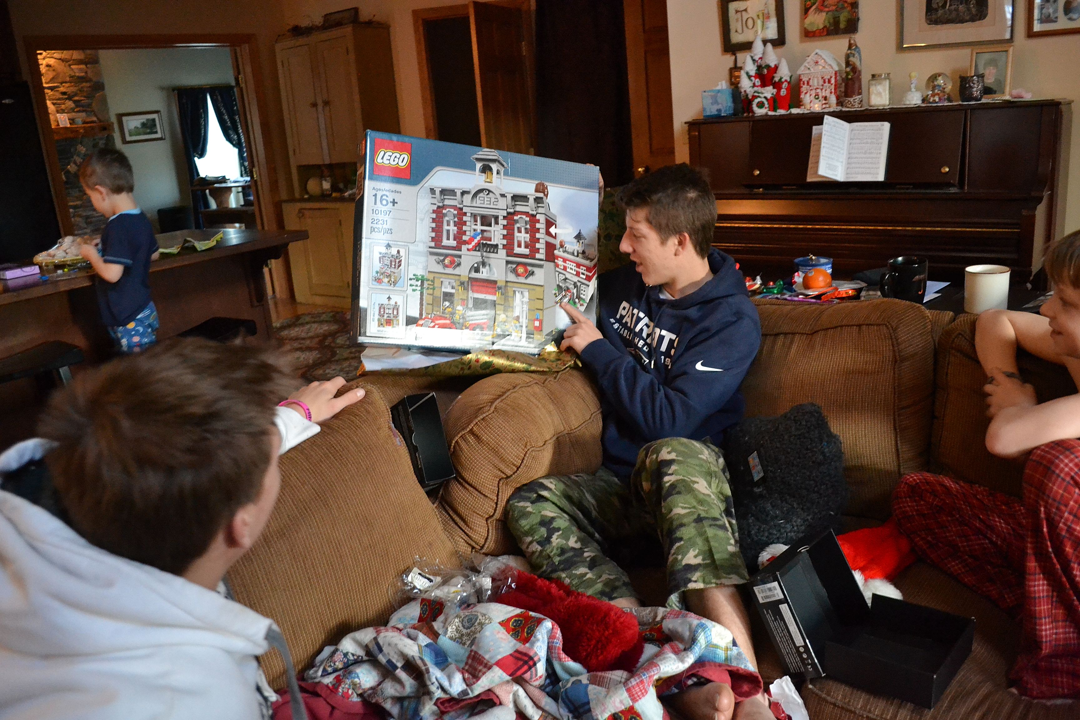 Ethan put his box of GAP clothes on right away, with his cross necklace and cologne. Only then did he break open his lego set of the Eiffel tower. I texted brother Dave a picture of it when it was done and he texted back; “I was at the top of it!” Jacob’s set was of the United Nations building. Anyway, the older boys didn’t even ask for legos for the first time in approximately 10 years so I bought them each one set because I was sooooooo sad.