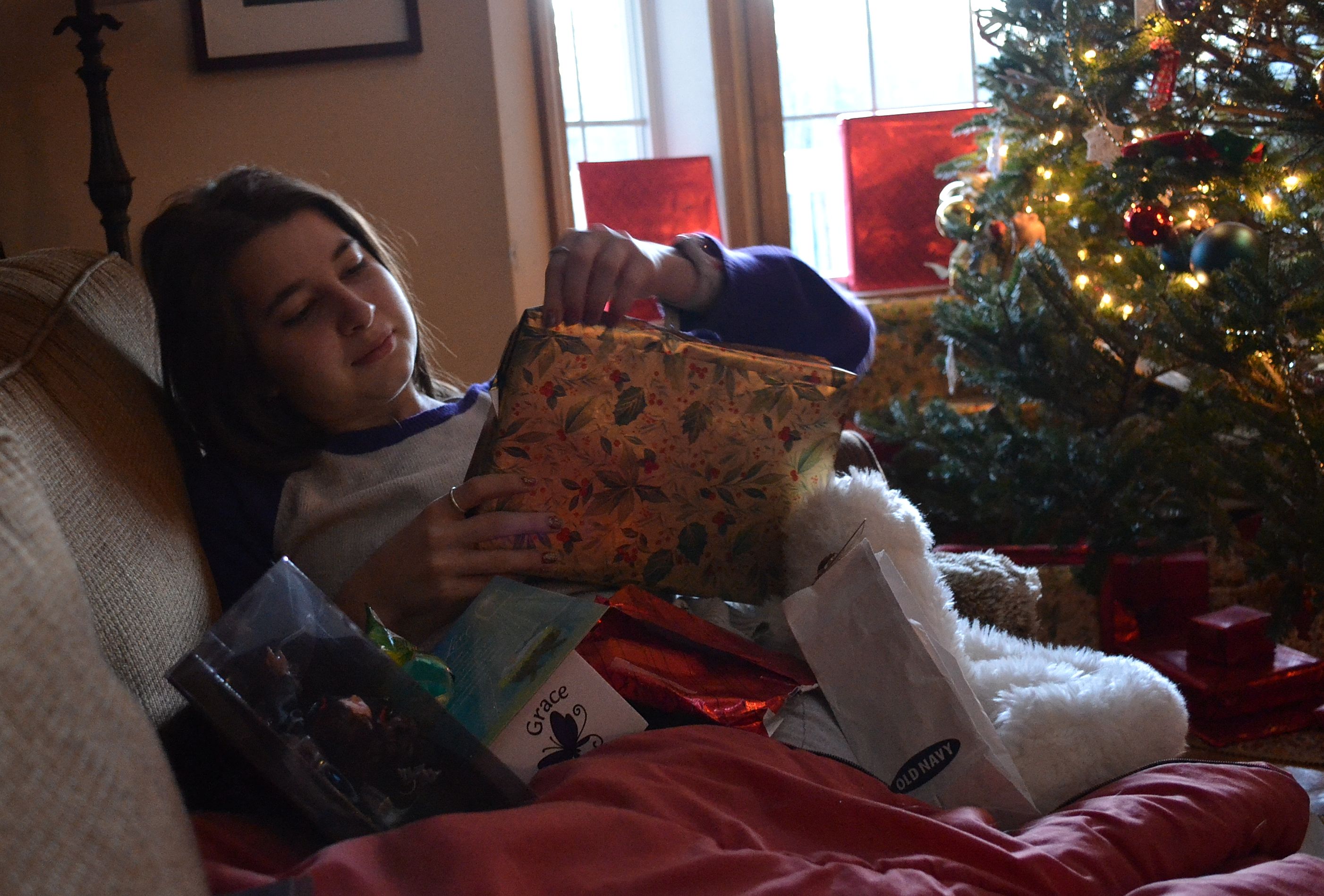 A sight to stop me in my tracks. Caleb snacked on all his stocking candy during his lego-building-time. (pictured next to Grace’s little stack of gifts.) Grace has already completely read the Patricia MacLachlan book, White Fur Flying, which she said was really deep for a little kid’s book. Patricia MacLachlan wrote the beloved Sarah, Plain and Tall and I’ve been buying her books for Grace since she could read. Again, with her at 15 years old, I still couldn’t quite stop buying yet another this year (like the boys and their lego sets).