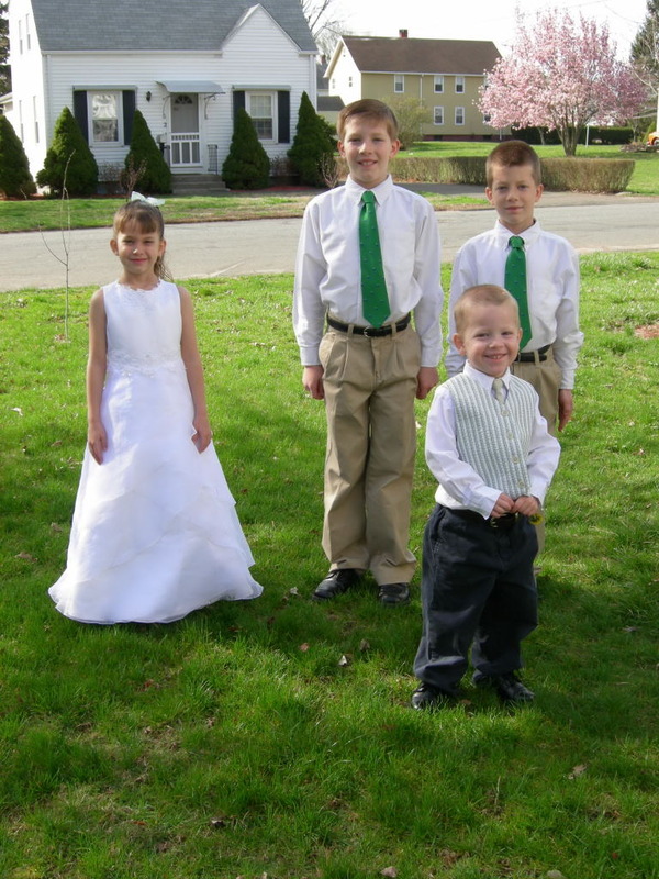 I found this old snapshot of the kids, taken in our old neighborhood. Caleb was a baby and not in the photo. Grace is wearing her flower girl dress and Jake and E are dressed exactly the same, and standing exactly the same, too. Little Davy has such a sweet smile on his face. Isn’t it funny how a simple picture can make a person happy and sad at the same time? I remember how Grace, at this age, used to hate getting sun in her eyes, and was very sensitive about outdoor photography, you can see it in her face in this picture, too.