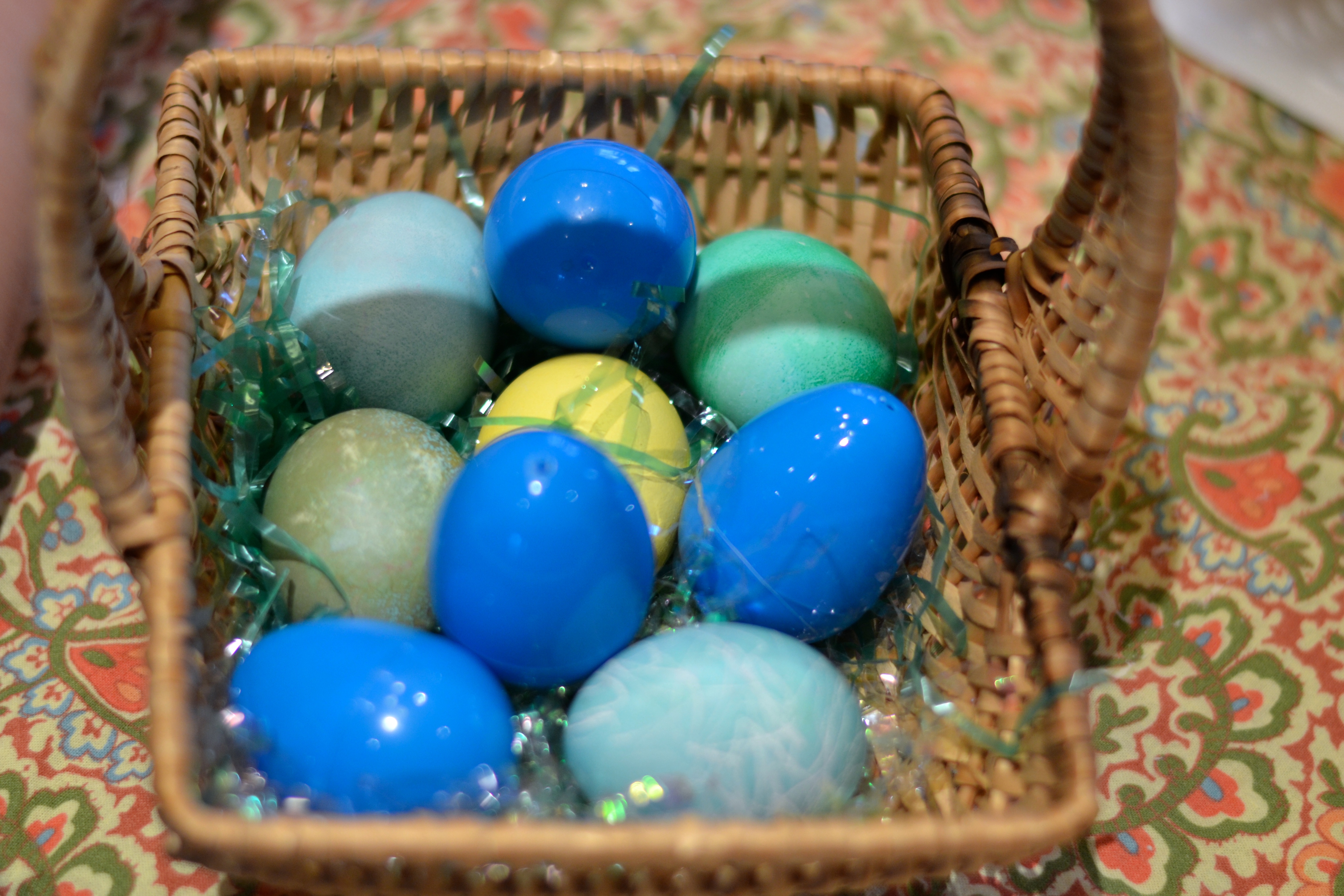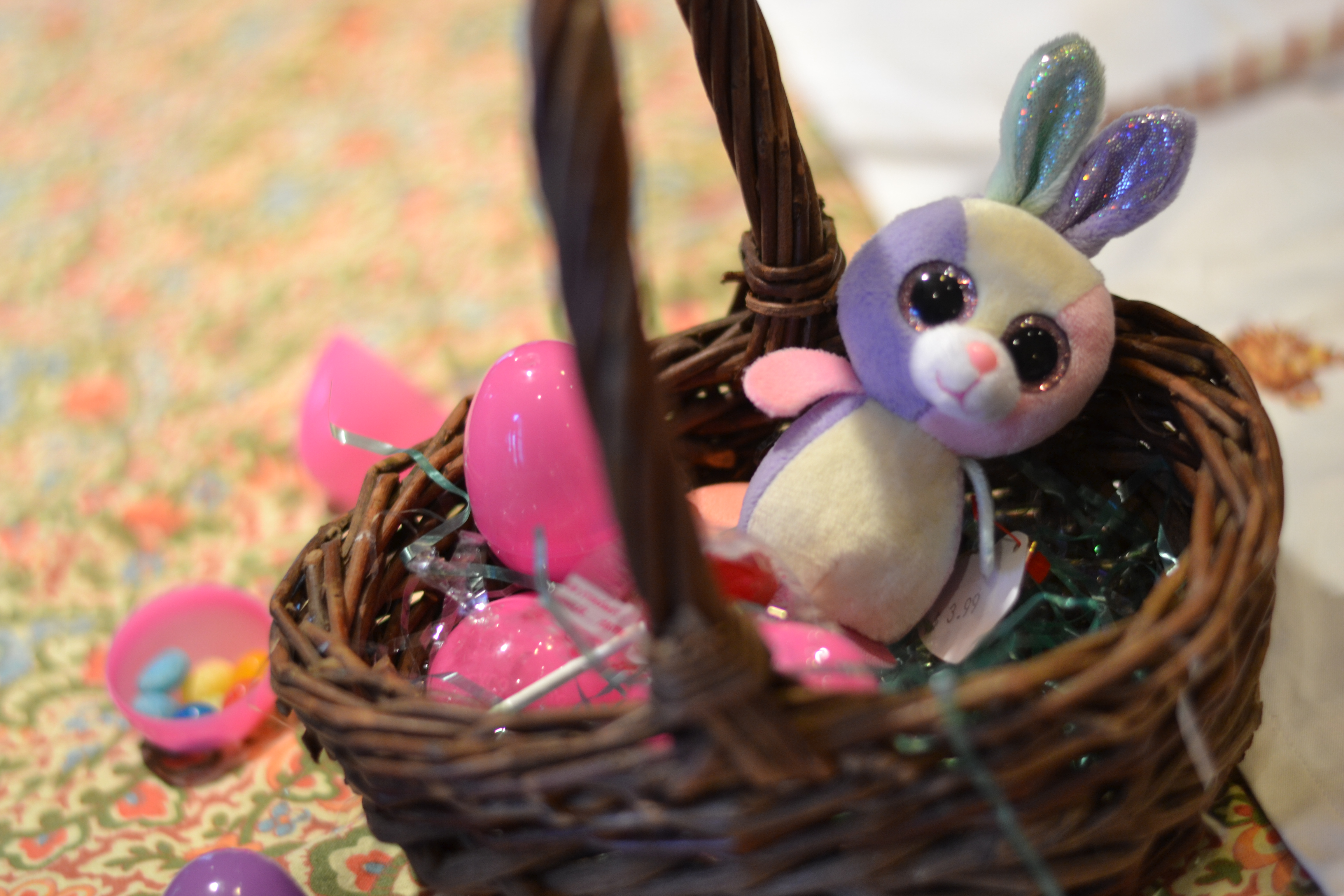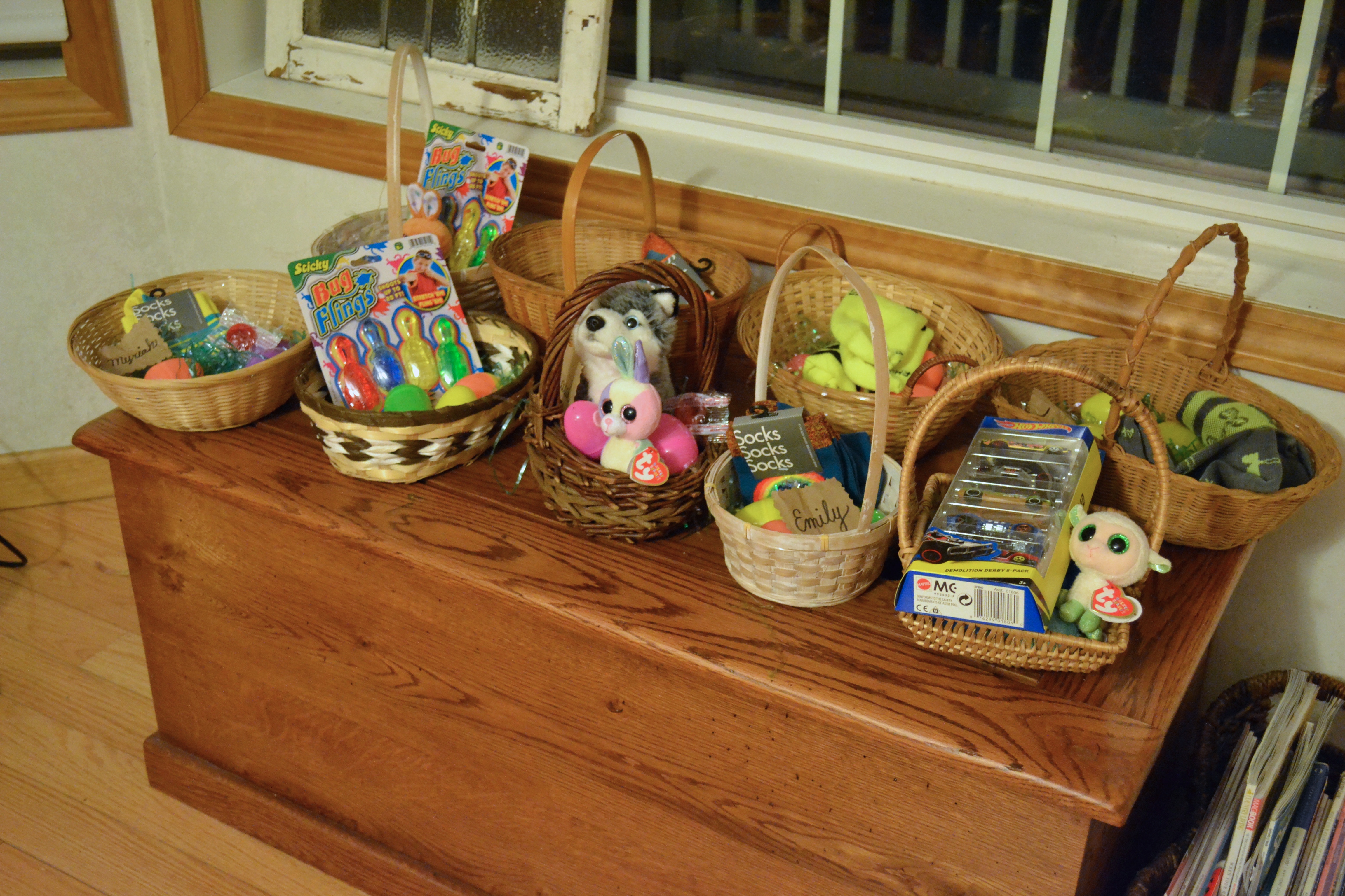 I spent five dollars on the actual baskets from our local thrift store, and I put jelly bean filled eggs in each one, with a gift. I accidentally bought two bags of very SOUR jelly beans but the children still liked them. Seth had matchbox cars, David and Caleb had sticky bugs that they could shoot with their finger at the windows, Sarah had a stuffed animal, and the older teens each received a pair of new socks. Simple, but enough to keep them all excited about the day.