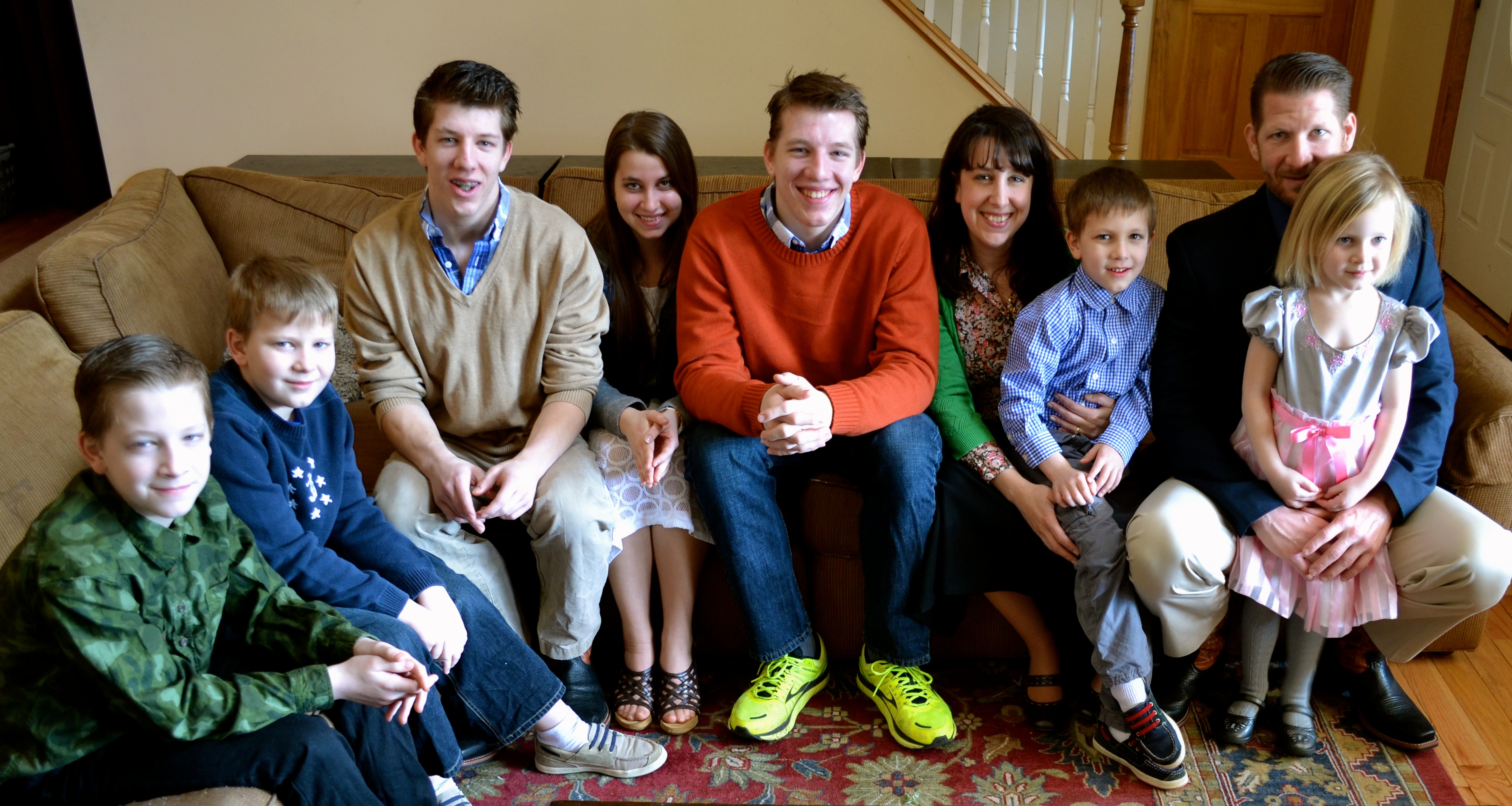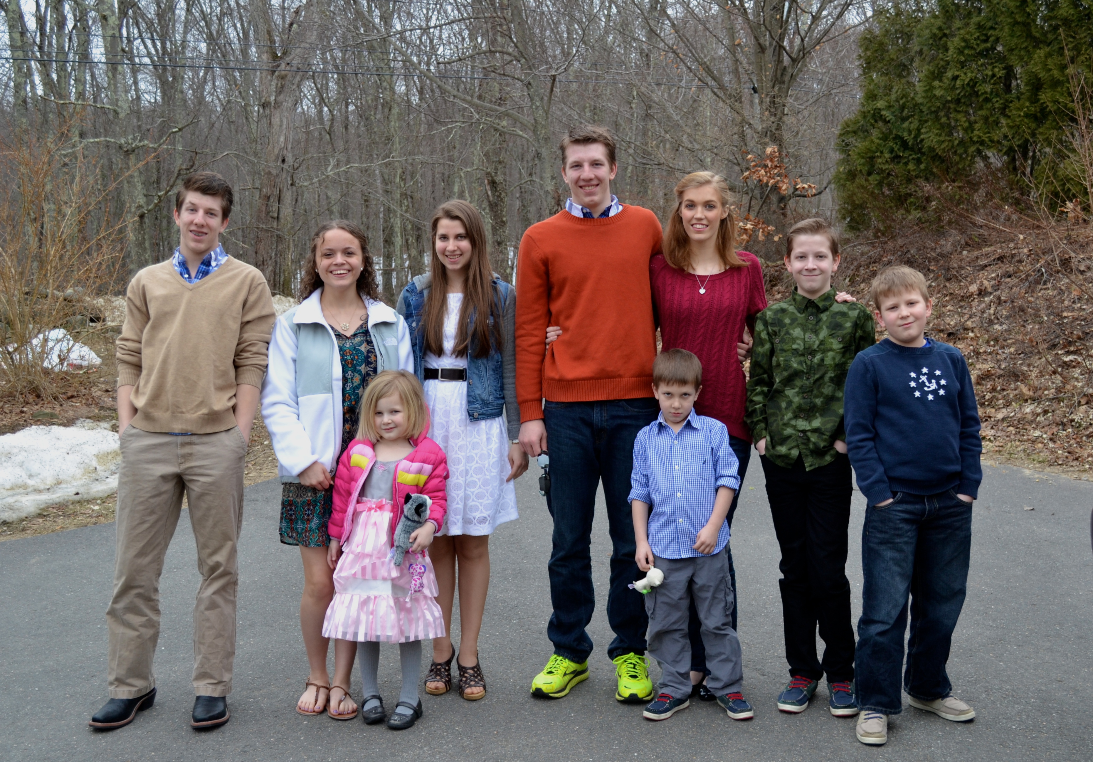 Here is a photo of all my children yesterday when we got back home. I wouldn’t let them in the house until I took a picture of them all….my own offspring plus Jacob’s girlfriend Emily (red sweater), and Myriah (white jacket), a young family friend who lives in Virginia and came to visit us during her spring break. She will be here all week.
